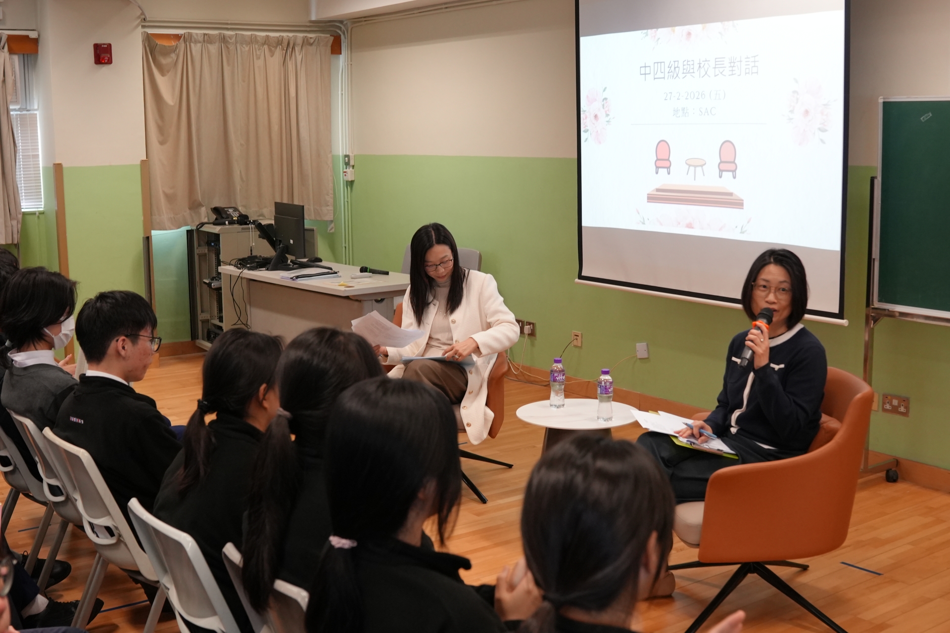 2026年2月27日(五)全方位活動時段,本校中四級同學參與了「與校長對話」活動。是次活動旨在建立雙向溝通平台,讓同學就學校一般事務提出建設性建議。活動期間,同學們表現踴躍,校長亦積極回應學生訴求。透過直接對話,不僅增加了同學對學校事務的關注及歸屬感,更有助於培養學生的公民責任心。