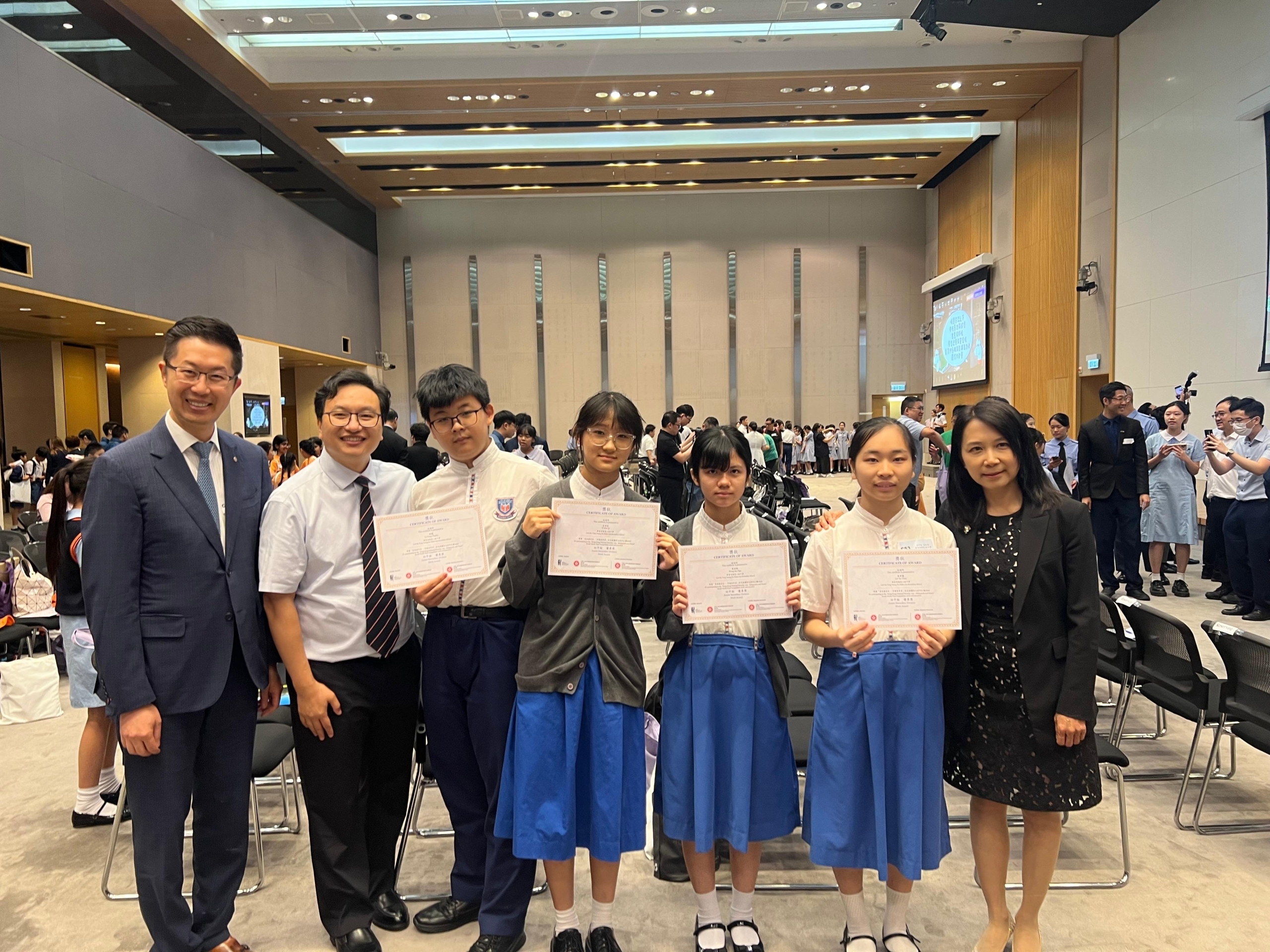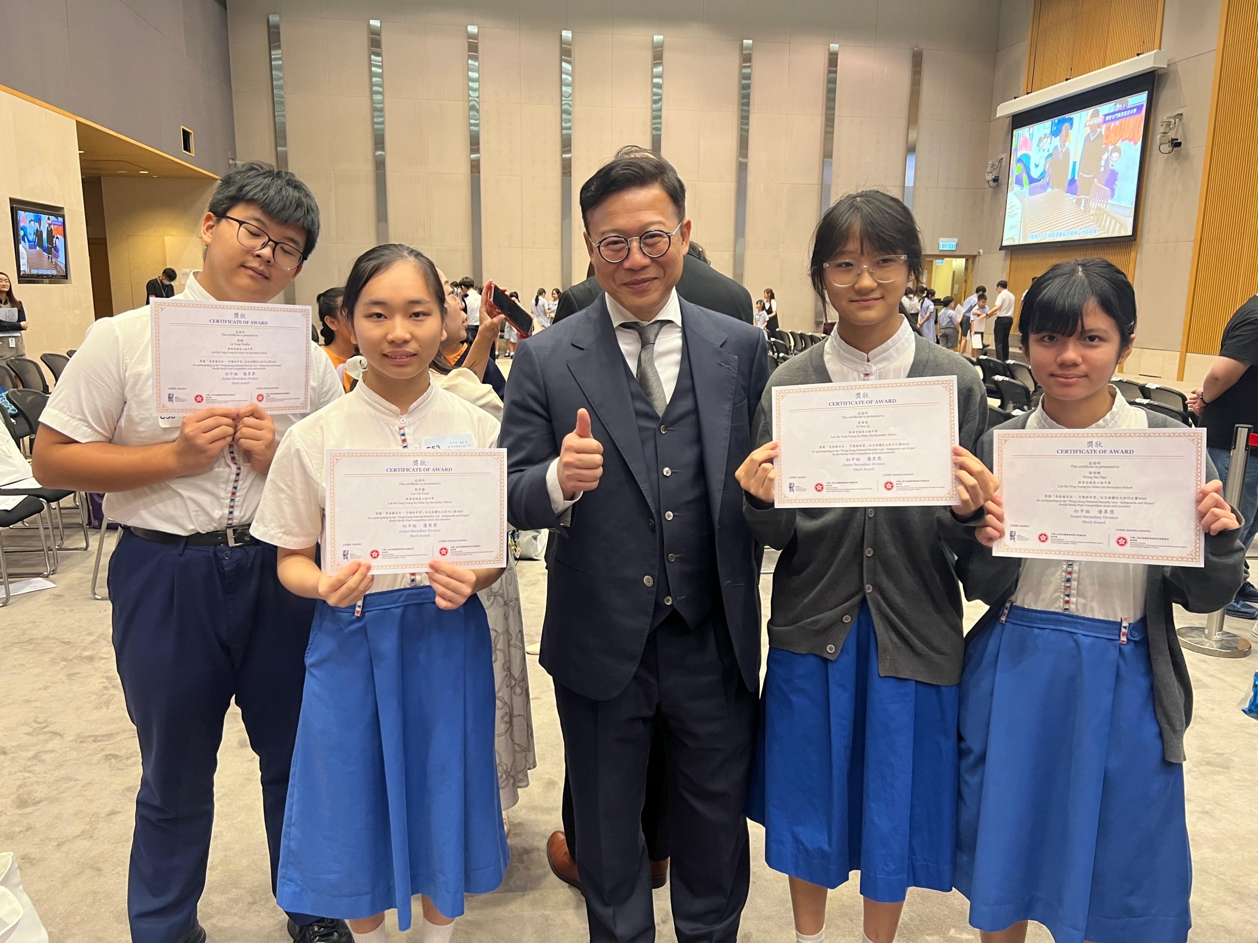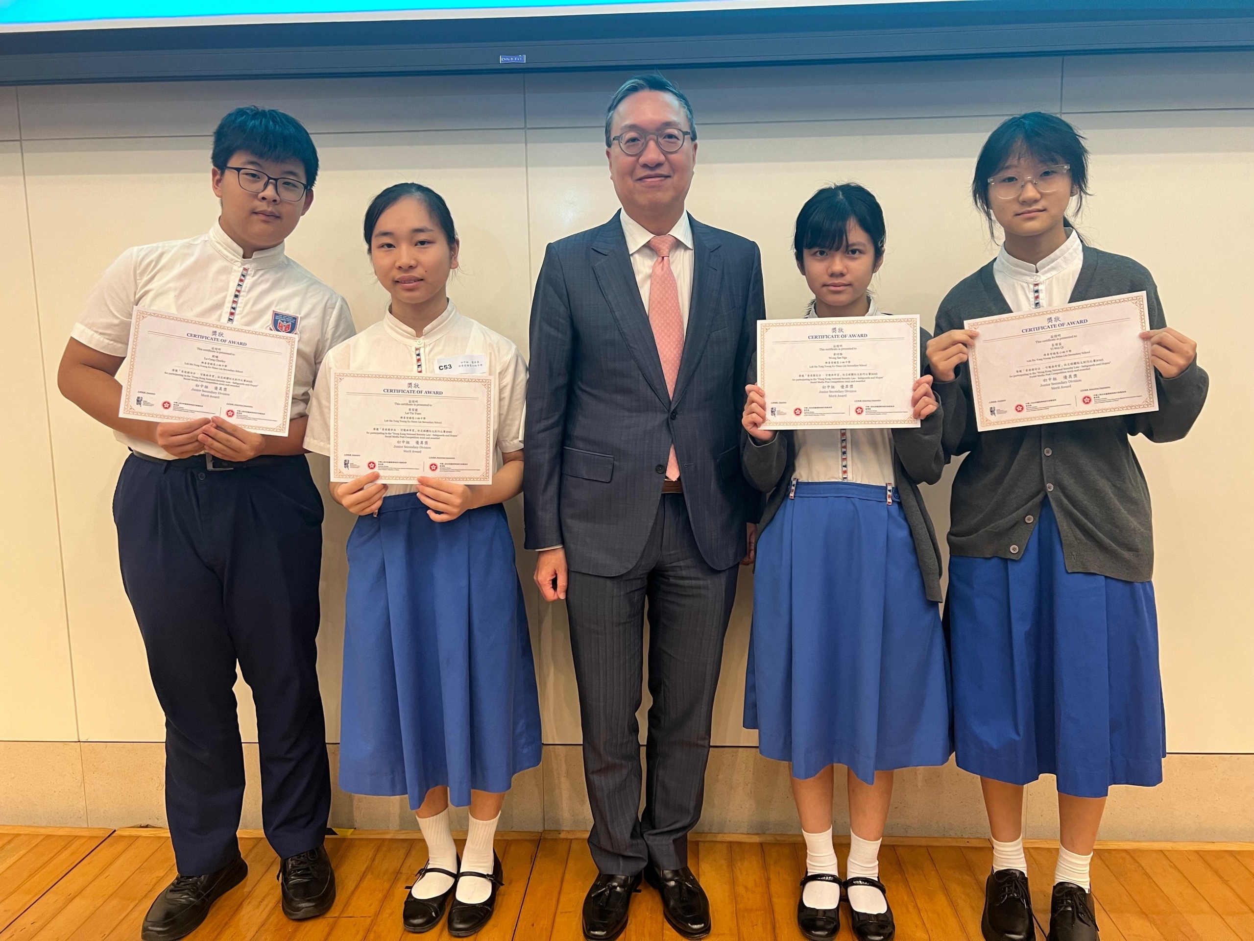 同學們憑藉卓越的創意與表達能力,從逾 600 份參賽作品中脫穎而出,榮獲優異獎殊榮,並於2025年10月3日獲邀出席於添馬政府總部會議廳舉行的「多元卓越頒獎典禮」,由律政司司長林家國先生親自頒發獎項,更有機會與副司長及律政專員合照留念。