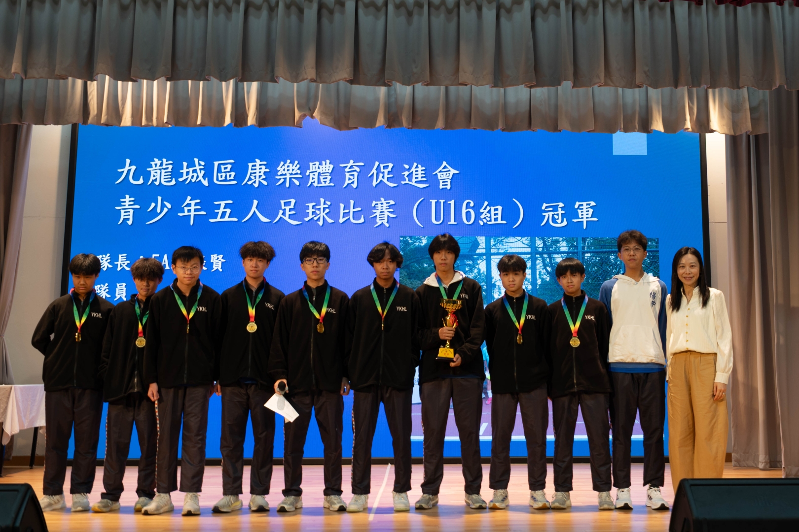 隊員:4A李子揚、岑皓朗、4B方景謙、4C許文軒、郭梓謙、4D林子峰、5B羅慶洋、曾梓晉、5C葉子鋒、6B吳啓謙、吳子謙、6C周國熙、6D鍾智睿 - 九龍城區青少年五人足球比賽 (U16組) 冠軍