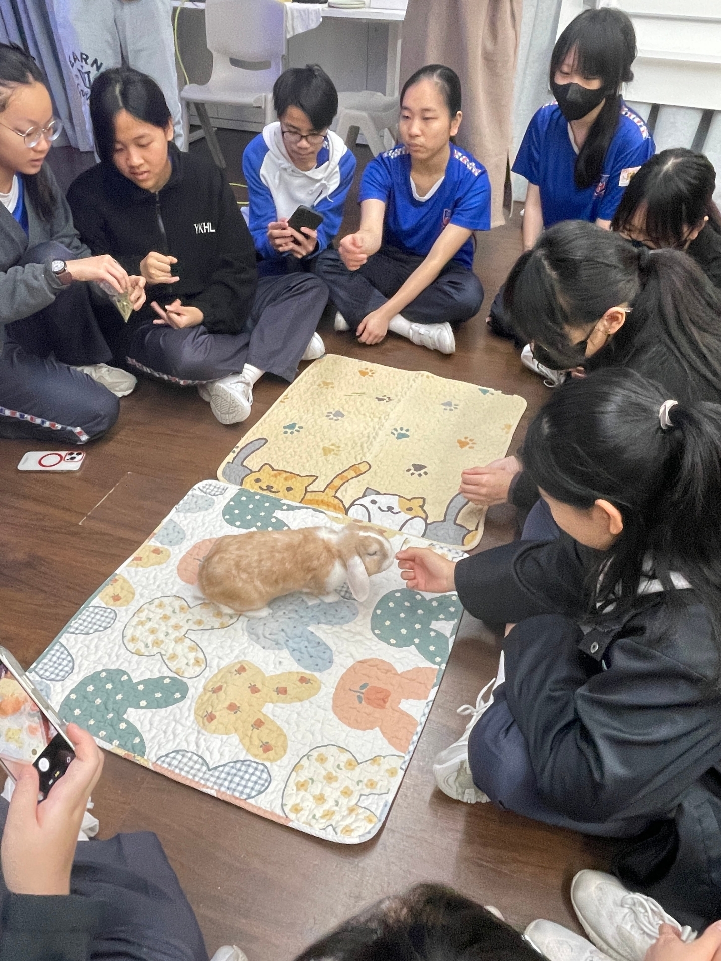 活動旨在讓學生深度探究現今社會嚴重的動物棄養問題,並灌輸愛護動物及尊重生命的正確觀念。學生前往香港青年協會隆亨青年空間,以小組形式參與體驗。透過與兔子的近距離接觸,學生進行了獨特的「靜觀」練習——在安靜的氛圍中,學習觀察與聆聽動物的需求,並在過程中沈澱思緒,聆聽自己的心靈。