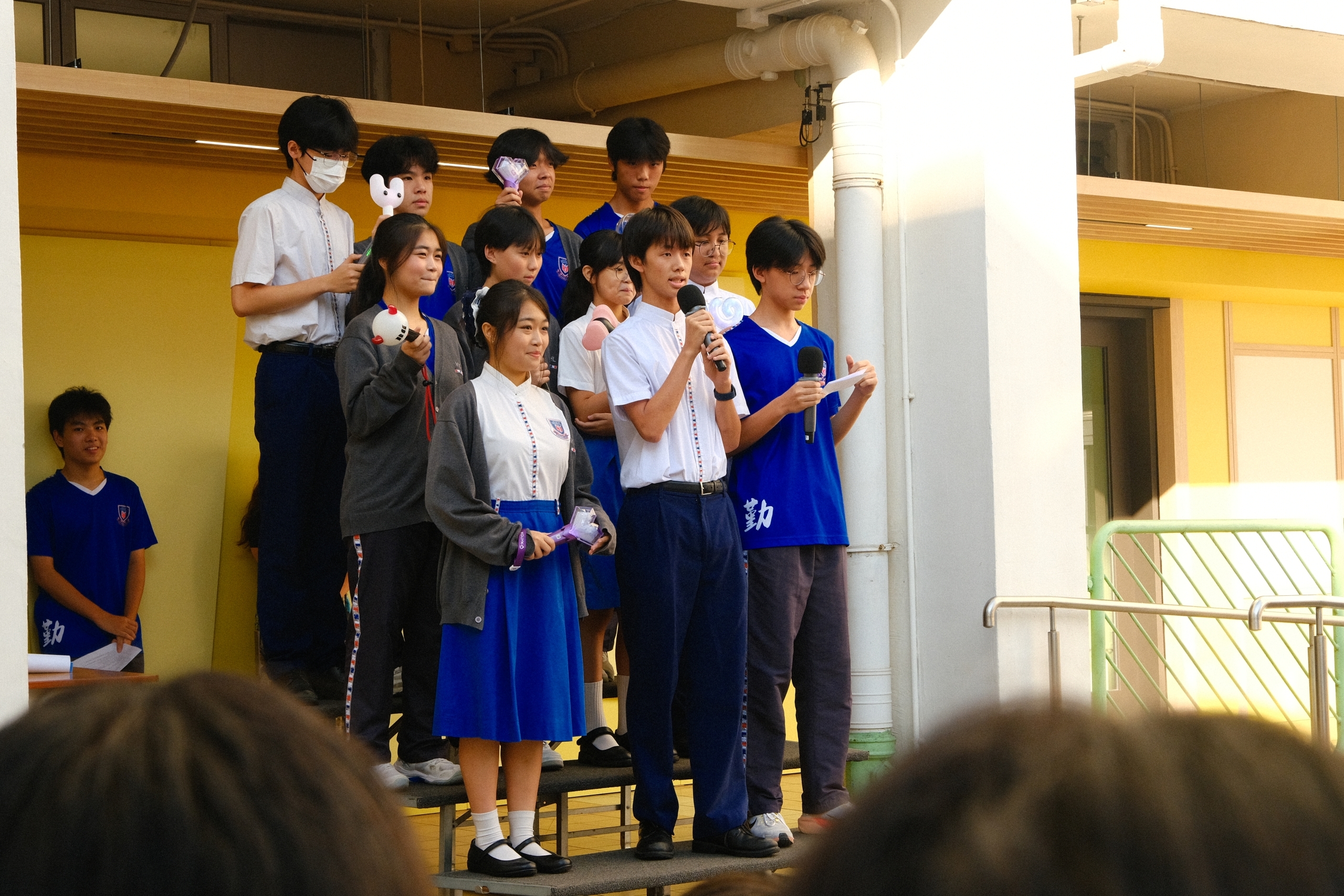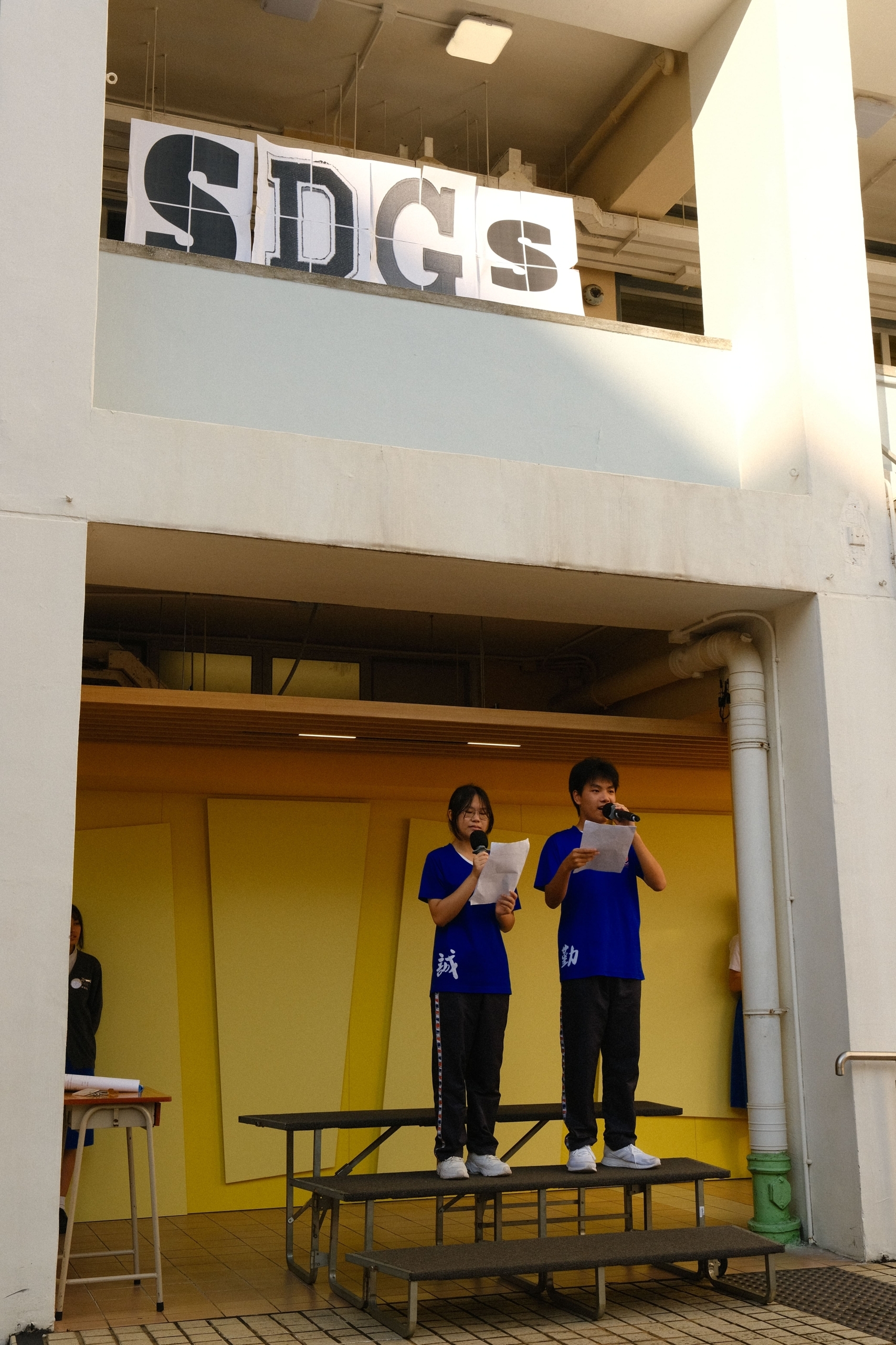 本日早會為可持續發展領袖生分享、第76屆香港校際朗誦節比賽朗誦節頒獎及侯選學生會內閣選舉宣傳。