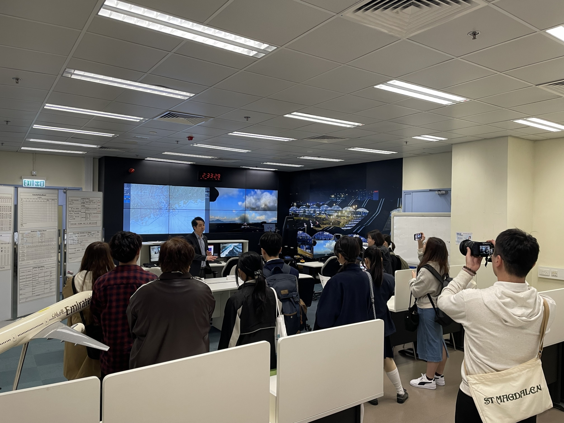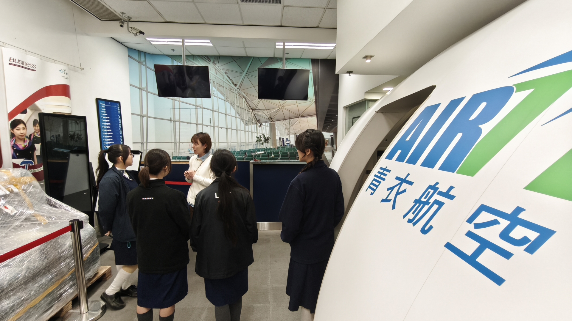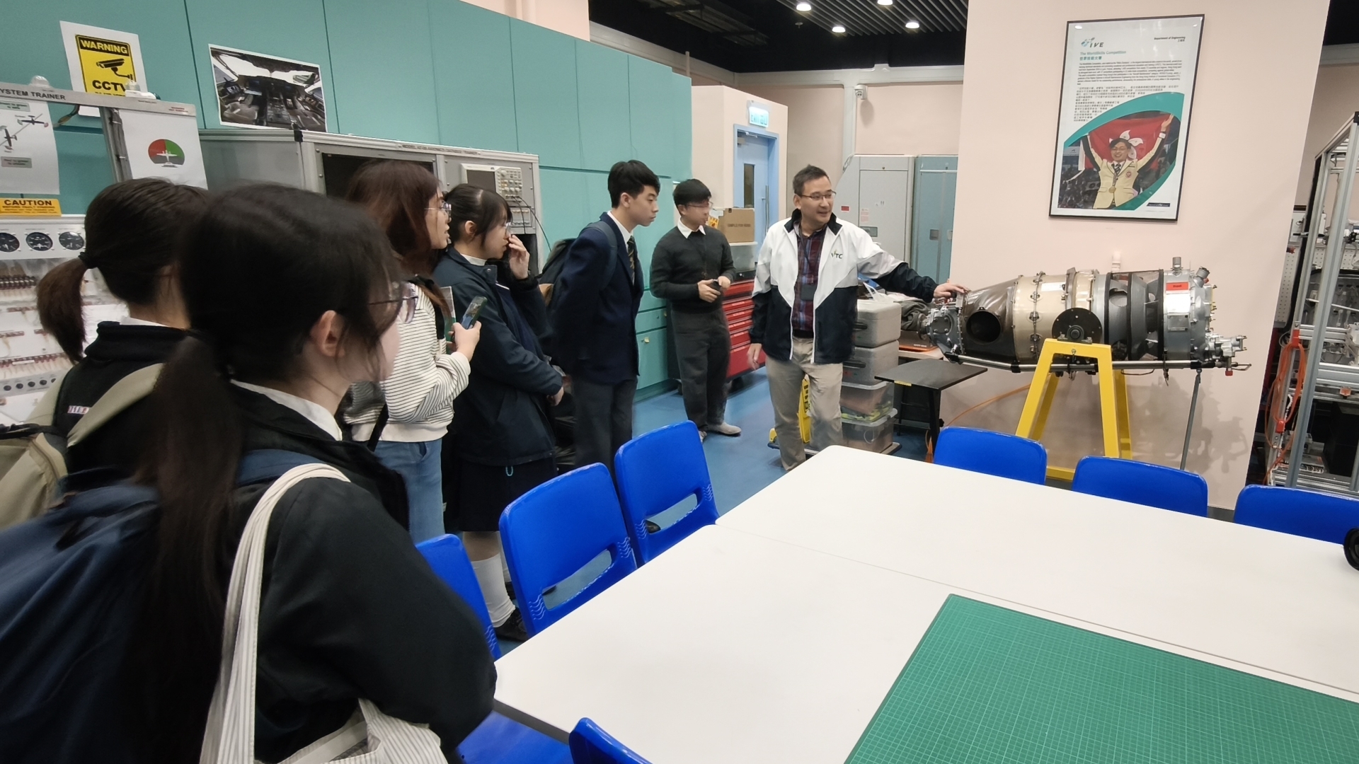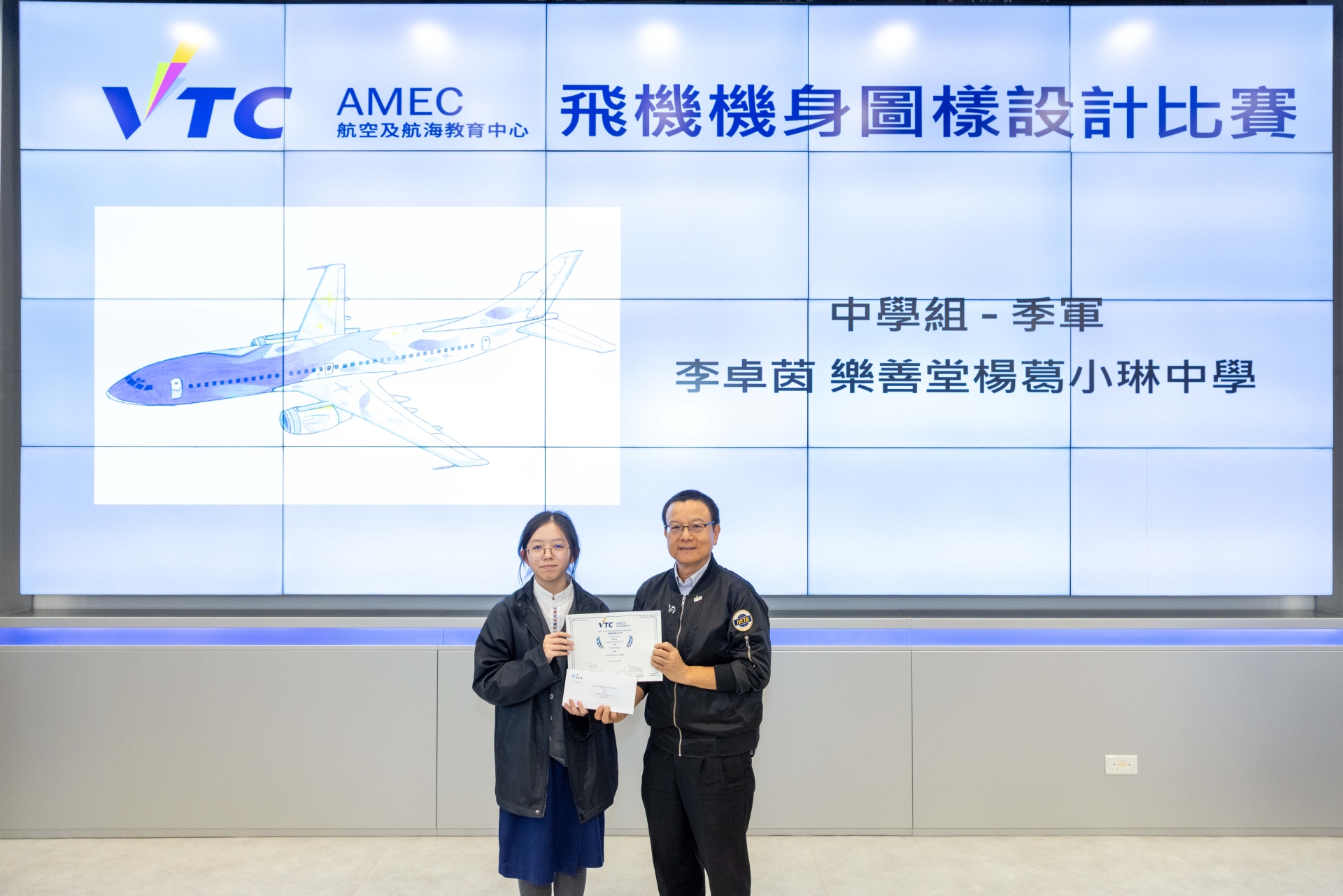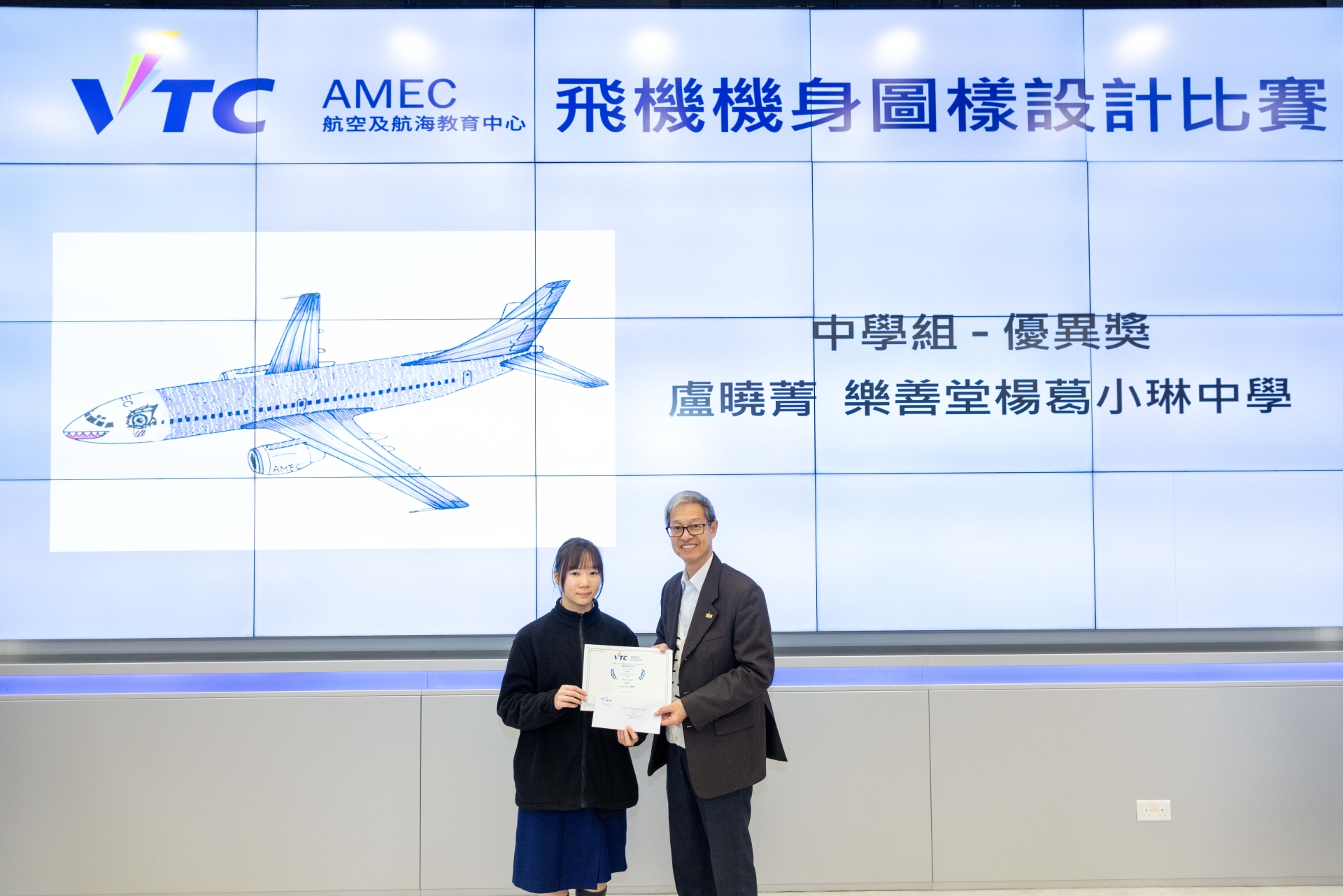 早前兩位中四同學參加「AMEC 飛機圖樣設計比賽」,憑著獨特的設計意念,在眾多作品中脫穎而出,喜獲佳績:中學組季軍:4A 李卓茵中學組優異獎:4D 盧曉菁頒獎禮當日,同學更獲邀參觀青衣 IVE 航空及航海教育中心。除了領獎外,更參觀了飛行訓練模擬駕駛艙、飛機維修工場及機艙服務培訓室,近距離接觸航空業的專業運作,大開眼界!再次恭喜兩位同學,展現了藝術才華並為校爭光!