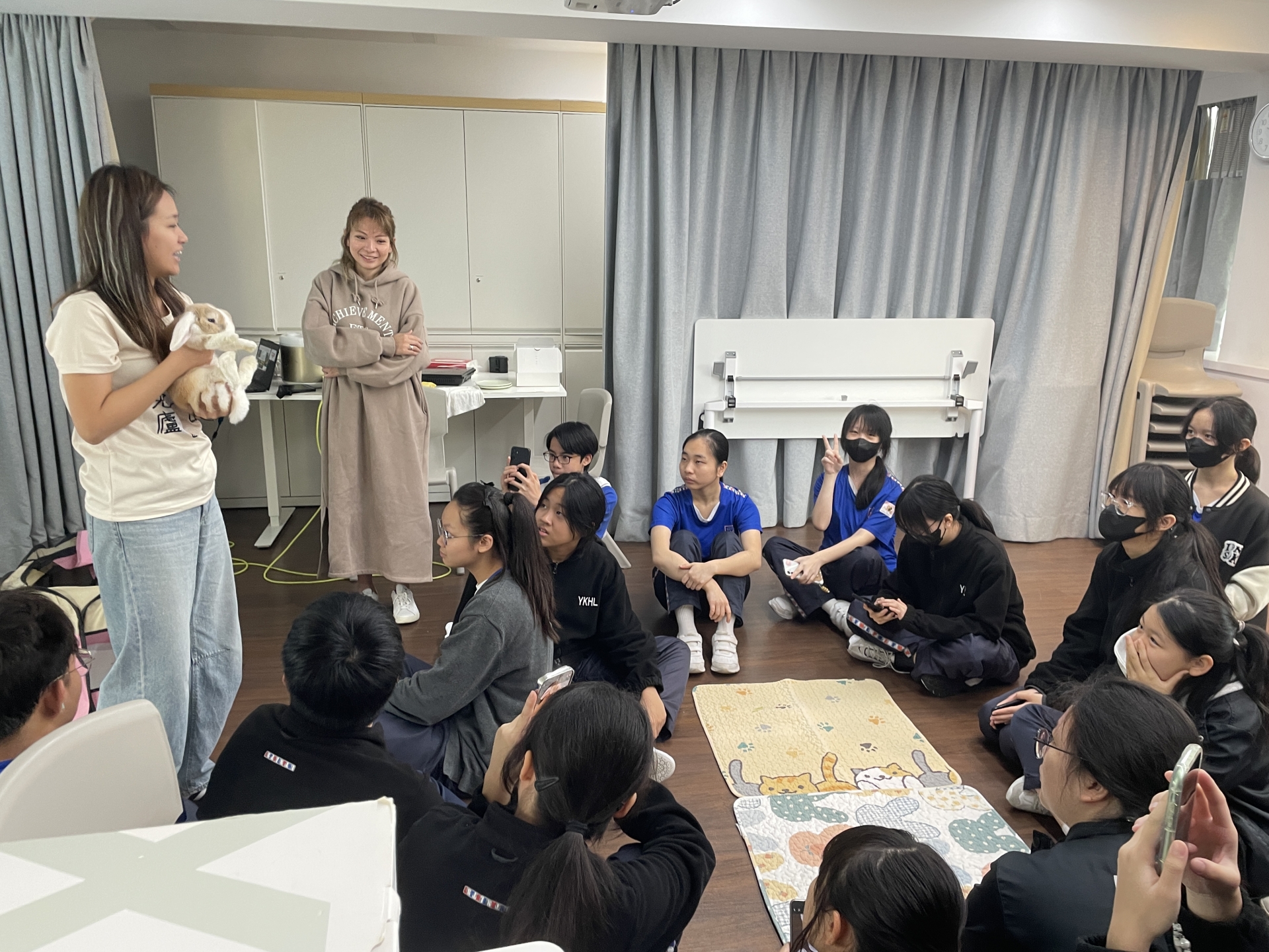 活動旨在讓學生深度探究現今社會嚴重的動物棄養問題,並灌輸愛護動物及尊重生命的正確觀念。學生前往香港青年協會隆亨青年空間,以小組形式參與體驗。透過與兔子的近距離接觸,學生進行了獨特的「靜觀」練習——在安靜的氛圍中,學習觀察與聆聽動物的需求,並在過程中沈澱思緒,聆聽自己的心靈。