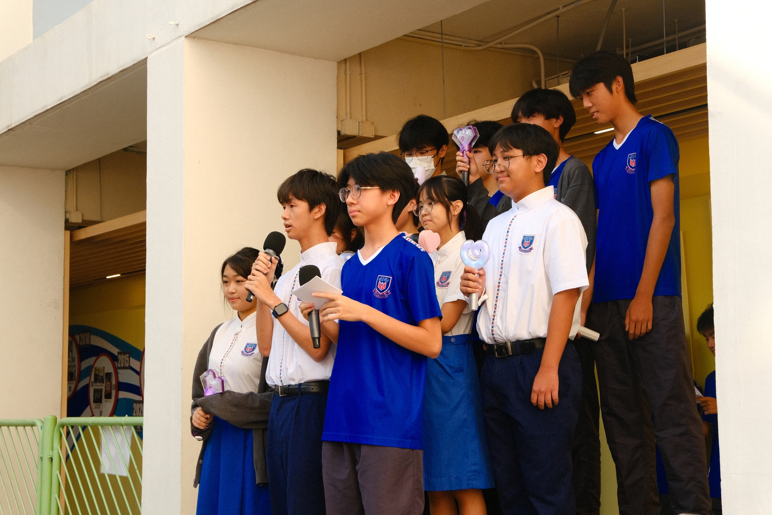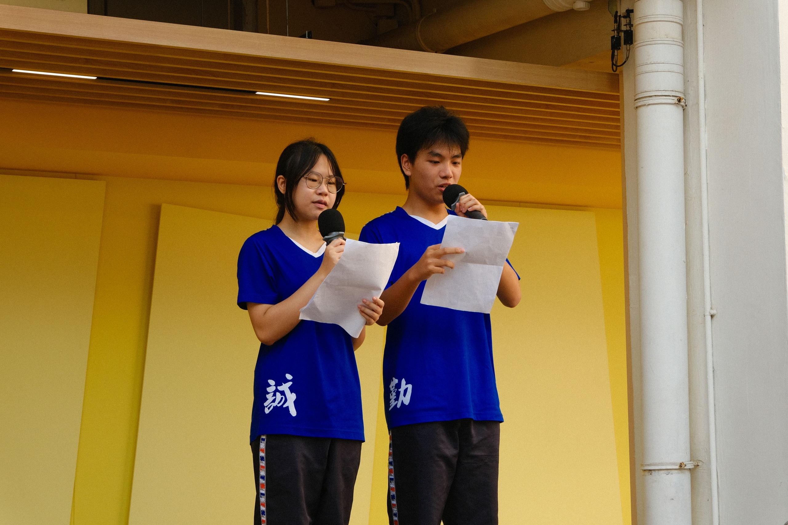 本日早會為可持續發展領袖生分享、第76屆香港校際朗誦節比賽朗誦節頒獎及侯選學生會內閣選舉宣傳。